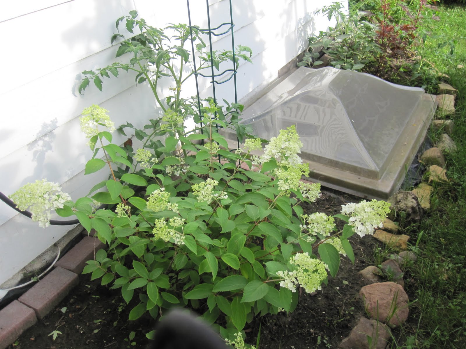 and then went outside to inspect my Mother's Day gift--a new hydrangea bush. It's starting to flower! Please note the volunteer tomato that sprouted and has flowers right behind the hydrangea, but don't pay any attention to all the little clovers also volunteering.